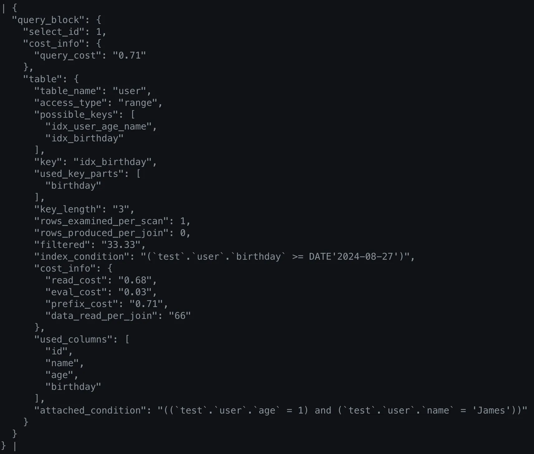 EXPLAIN FORMAT=json SELECT * FROM user WHERE birthday >= '2024-08-27' AND name = 'James' AND age = 1;