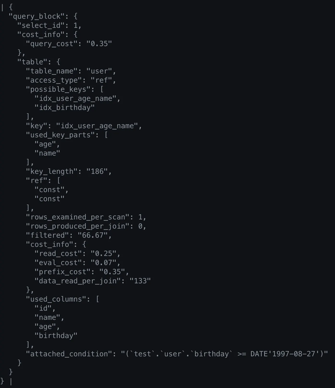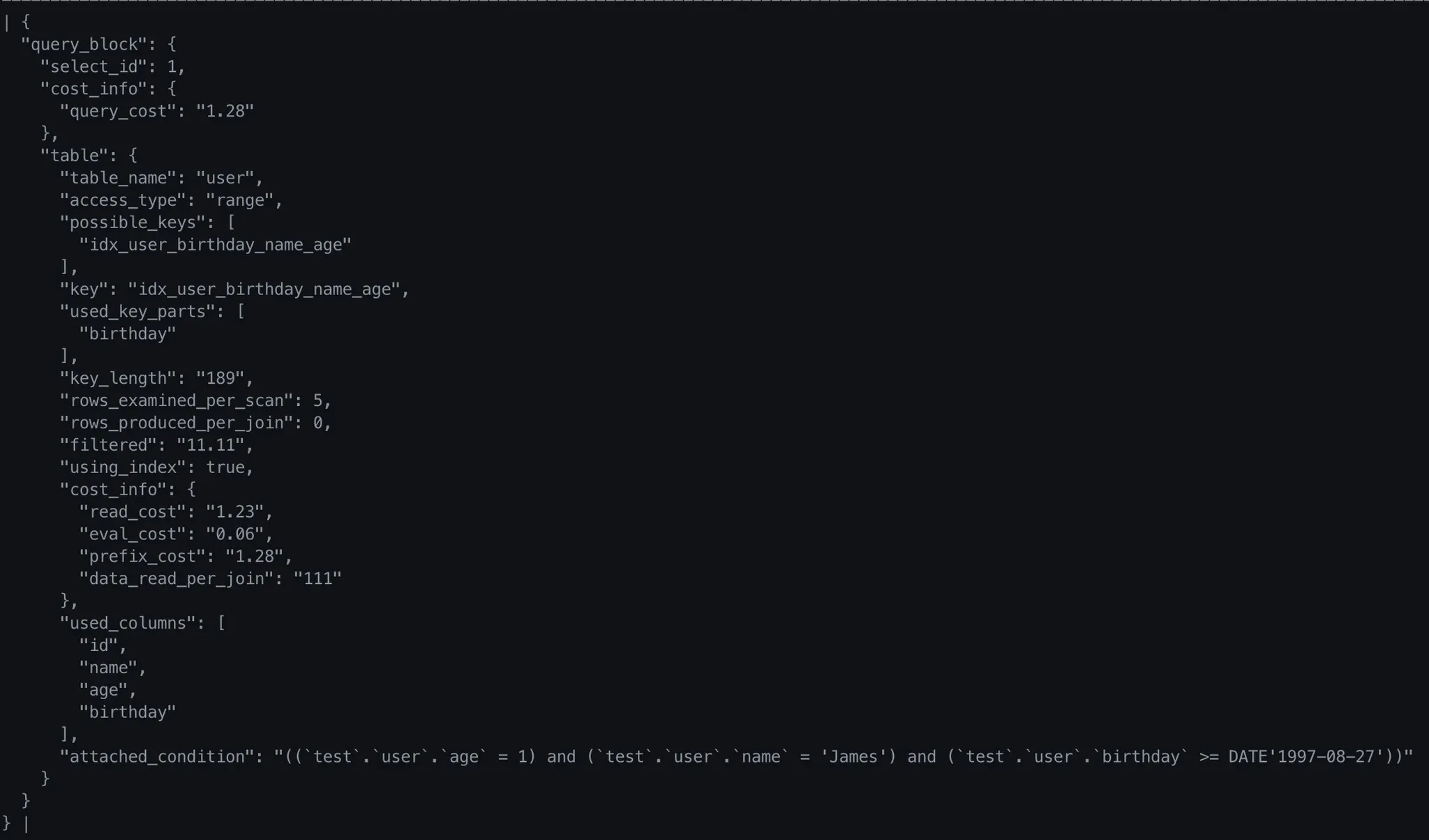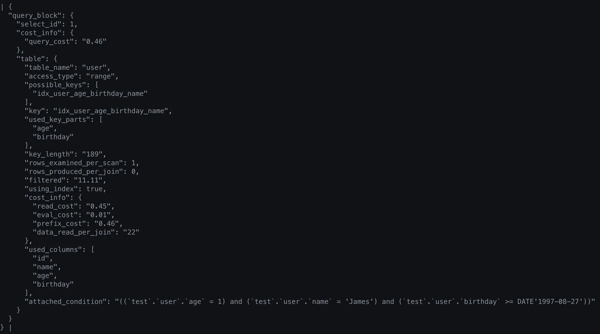 EXPLAIN FORMAT=json SELECT * FROM user WHERE birthday >= '1997-08-27' AND name = 'James' AND age = 1;