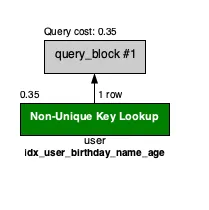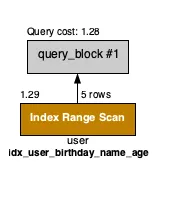 -> Covering index range scan on user using idx_user_birthday_name_age over ('1997-08-27' <= birthday AND 'James' <= name AND 1 <= age) (cost=1.28 rows=5) (actual time=0.049..0.068 rows=5 loops=1)