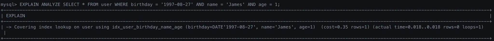 EXPLAIN ANALYZE SELECT * FROM user WHERE birthday >= '1997-08-27' AND name = 'James' AND age = 1;