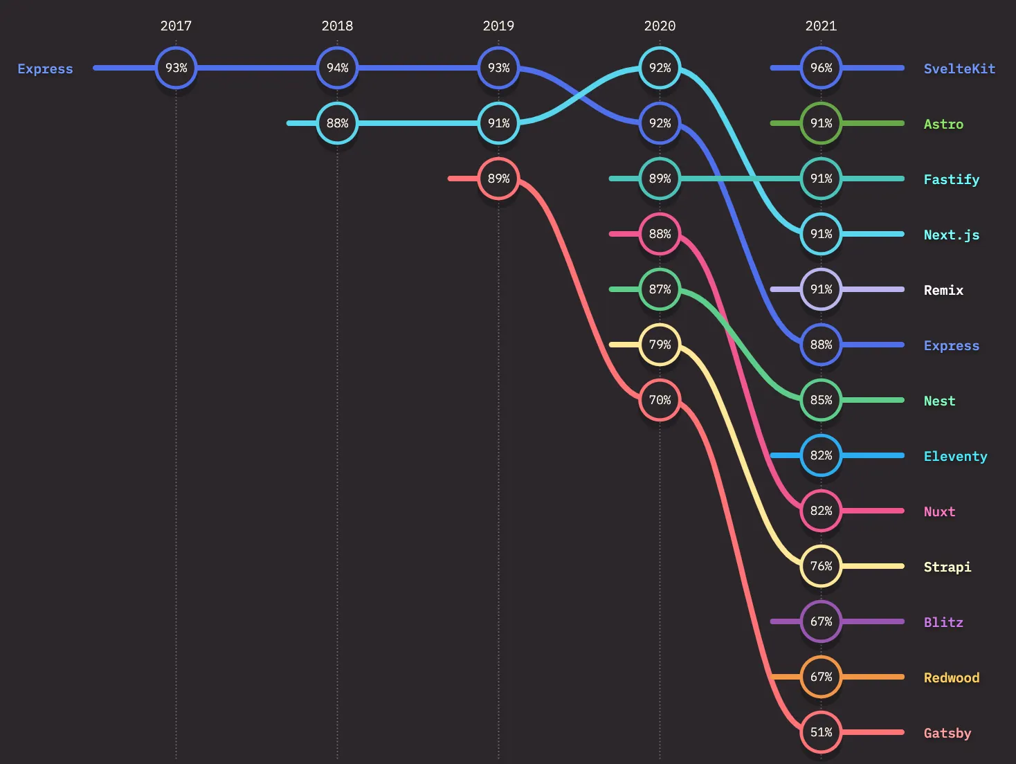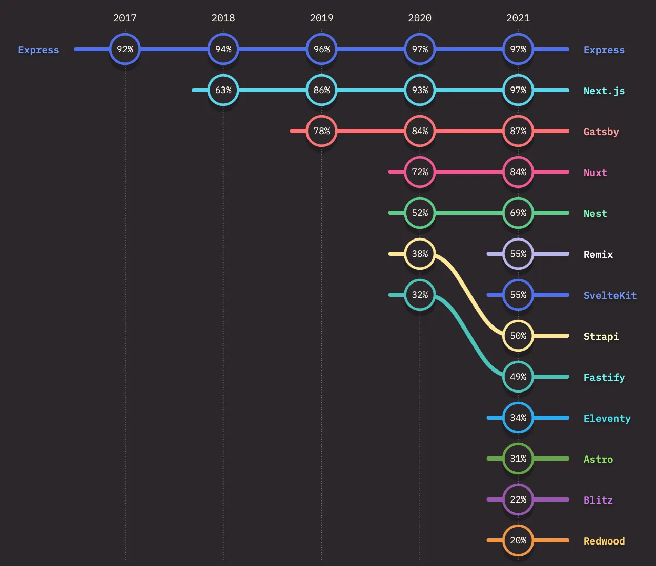 State of JS 2021 설문 조사 결과를 보면 아직 사용경험은 아직 저조합니다. Express가 1위인 이유는 NestJS가 그러하듯 다른 프레임워크들이 Express를 기반으로 만들어 진 것들이 있는 영향이 있습니다.