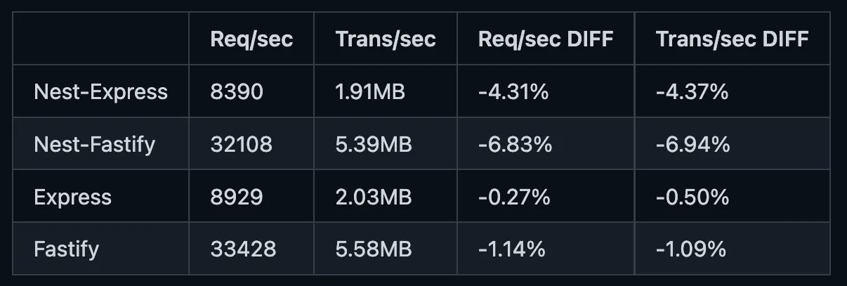 하지만 순수 Express/Fastify로 서버를 개발하다 보면 필수로 요구하는 라이브러리들을 추가하고 되고 결국 NestJS에서 제공하는 기능들을 모두 구현한다고 했을 때 성능이 크게 차이가 나지는 않습니다.