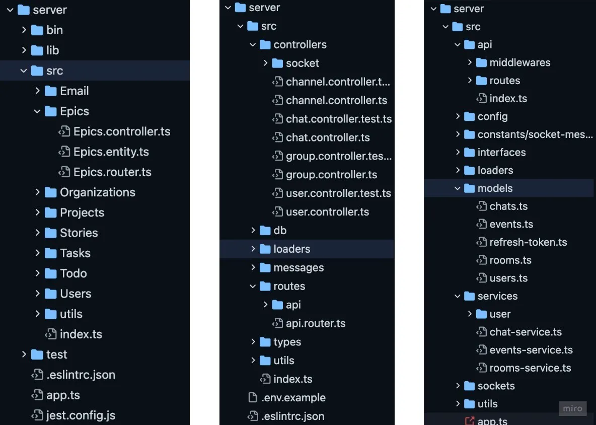 router -> controller -> entity, routes -> controller -> db, routes -> service -> model 등 다양한 구조로 개발한 것을 알 수 있습니다.