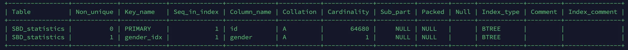 non-unique index로 가져오기 때문인거같다. 하지만 성별의 경우 0, 1 두개로만 나뉘는데 아무리 non-unique index라지만 이게 정말 빠를까라는 생각을 했다.