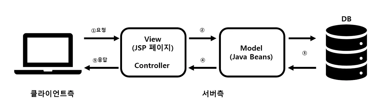 Controller 영역에 View 영역을 같이 구현하는 방식이며, 사용자의 요청을 JSP가 전부 처리합니다.