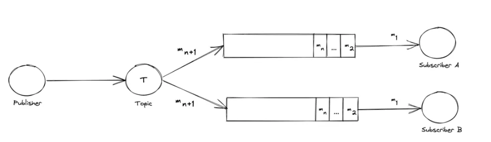 주제에 메시지가 게시되면, 해당 주제를 구독하는 모든 구독자에게 메시지가 전달된다. |