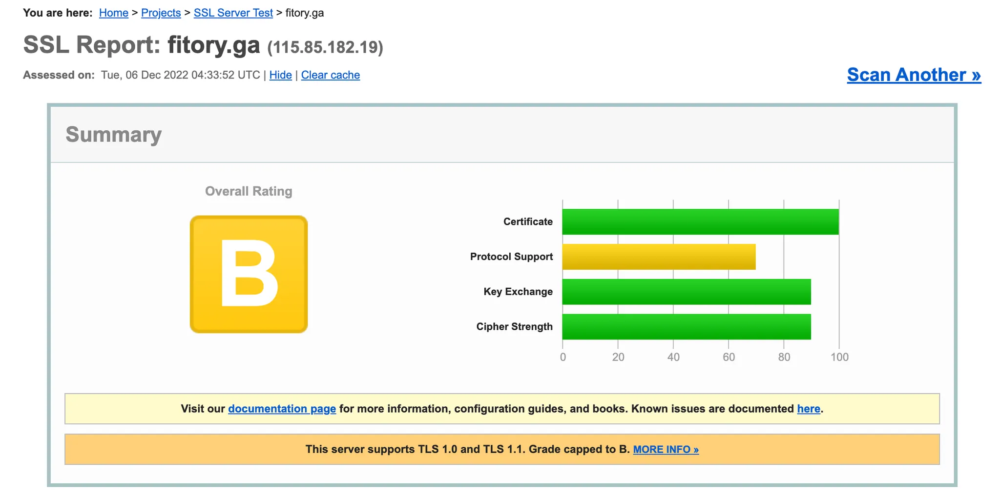 ssllabs.com를 통해 SSL Server Test를 한 결과 B등급이 나왔다. 해당 결과에 만족스럽지 못한 나는 Protocal Support에 문제가 있다는 것을 발견했다.