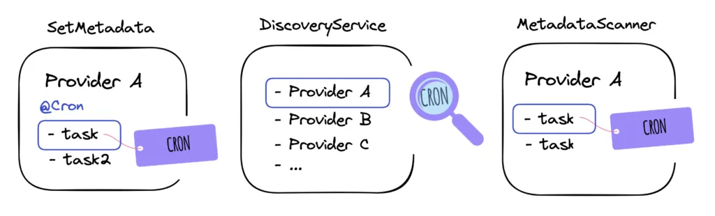 모듈이 초기화되는 시점에 DiscoveryService와 MetadataScanner로 모든 Provider 클래스를 순회하며 Cron 심볼을 메타데이터로 가지고 있는 메서드들을 찾는다.